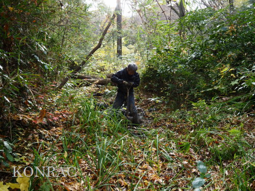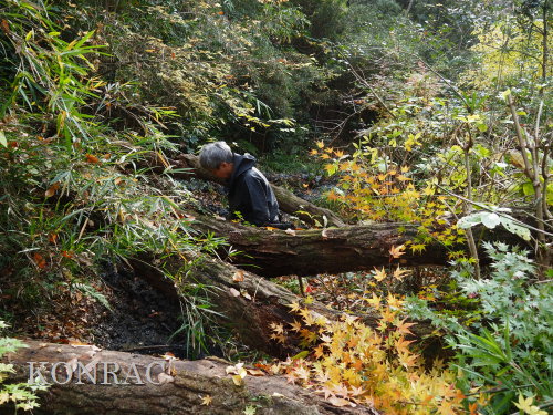下端域になると、水流であったことを想像させる状態ではなく、陸地化していました。 繁茂していたはずのビナンカズラは全くありませんでした。 何本もの伐倒木が散乱し、歩くのも容易ではありません。 ナラ枯れ木などを伐採して、放り込んでいたようです。 生田緑地は急傾斜地が多いので、伐倒したままにせざるを得ない場所もありますが、 ここは平坦地なので、適度な大きさに玉切りし、適切に積むことは可能なはずです。 行政は、2013年にマネジメント会議を設置し、生田緑地の植生管理計画の策定・運用を始めたわけですから、 ナラ枯れ伐採を業者に発注する時には、植生管理計画を遵守した活動にさせる必要があると思います。 園路から見えなければ、放り込んでおけばいいということではなく、雑木林の育成に配慮した置き方を考えていただきたいと思います。