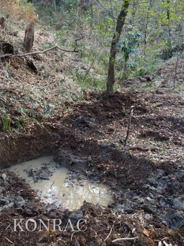 この少し下側の水溜まり穴02は、谷を横断する形で水溜まり穴を掘るつもりで、9/25(木)に掘ったのですが、谷を横断しきれていません。 水は涸れずに、小さな池の状態が続いています。