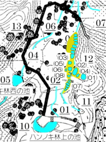 次回の活動時に、この水溜まりの水の状態を観察して、水があるなら、他の水溜まり穴についても、同様の方法で、常に水があるようにしたいと思います。 渇水期でも、水溜まり穴に水がある状態にすることが、第一段階として必要な条件だと思います。 今まで掘ってきた水溜まり穴は、想像した水流の流心に掘ったものでした。 この方法で水溜まり穴の水涸れを止めることができるなら、他の水溜まり穴も、同様に斜面裾部に繋げていけばよいことになります。 水が潤沢な時期には、水溜まりの水面が繋がって、水流をつくるので、その流れ方をイメージして、流路をつくっておけば良いと思います。 |