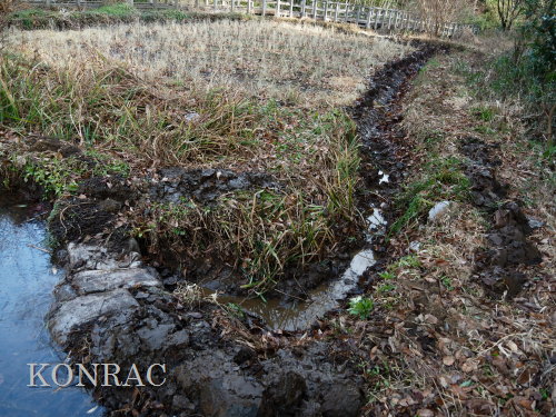 木道下を抜けて来る導水路の水の流れが気になったので、この田圃上の水路の泥上げを行いました。