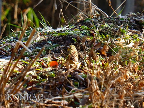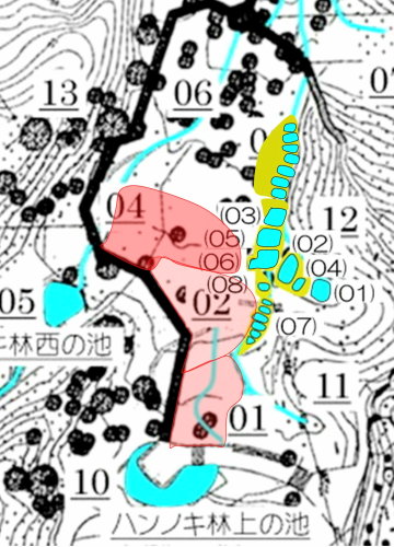 (上図)活動場所図 2/8(日)の降雪によって、若しかすると田圃の状態が変っているかも知れないと思い、谷戸に降りて、田圃まで来ました。 上の田圃から下の田圃にかけての木道下の草地には、多数のアオジが来ていました。