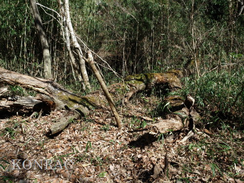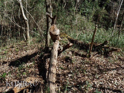 城山下谷戸合流部に移動しましたが、ここの水辺も完全に涸れていました。 合流部から城山下谷戸苗木畑に移動しました。 苗木畑は、2005年3月に、アパートが撤去された跡地です。 2007年3月に、北部公園事務所が押沼峠の工事残土の一部を搬入して、雑木林の植生管理に必要な苗木畑として使えるように、覆土してくれた場所です。 生田緑地の皆伐更新に使う目的でしたが、皆伐更新地区では、自然に発芽した実生を育てて雑木林を育成することができたので、苗木は必要なくなりました。 苗木畑の苗木は育っていたので、そのまま樹林にすることにしました。 2023年度末に、戸隠不動尊跡からの園路途中にあったナラ枯れ大径木を、生田緑地整備事務所が伐採してくれたのですが、苗木畑の上に伐倒して、そのまま放置されました。 1年後の2025年3月に、この伐倒によって受けたダメージを取り除くための活動を行いましたが、直径50〜60cmの幹材は片づけようがありませんでした。 ただ、苗木畑の苗木の中には、直径15cm超のものもありましたので、2025/3/25(火)に、苗木のうちの1本を萌芽更新目的で伐採しました。 これは、2025年夏期に萌芽しましたが、弱弱しい細い萌芽枝です。 もともと弱っていたことと、アズマネザサに覆われてしまっていたためと思います。 この伐り株周りから始めて、苗木畑のアズマネザサ刈り、材の片付けなどを行いました。