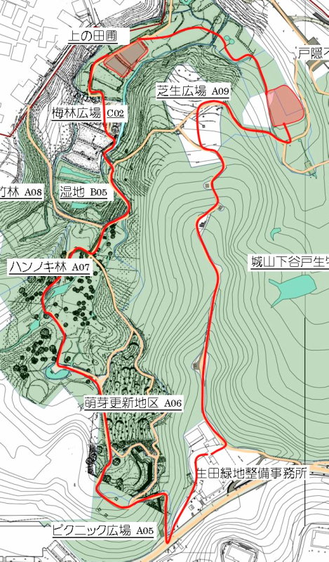 (上図)活動場所図 上の田圃に落葉を投入しました。 谷戸の田圃は、落葉だけを肥料として、稲を育てています。 その落葉は、指定管理者がイベントに使用した落葉をいただいています。 今朝、田圃に置いたとの連絡をいただいたので、田圃に投入しました。