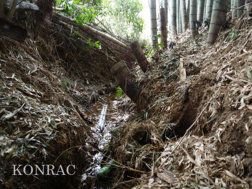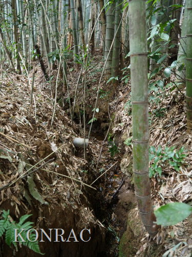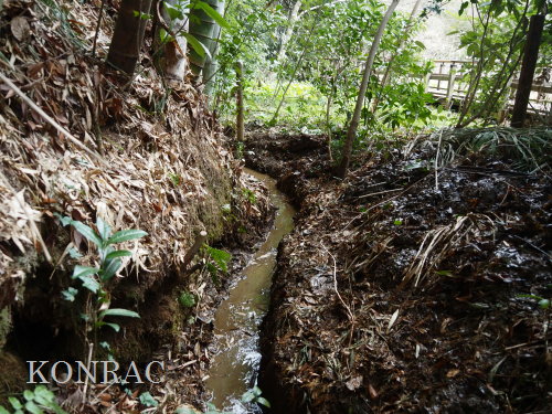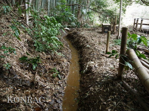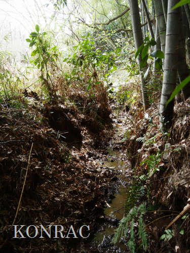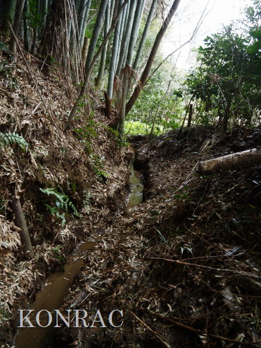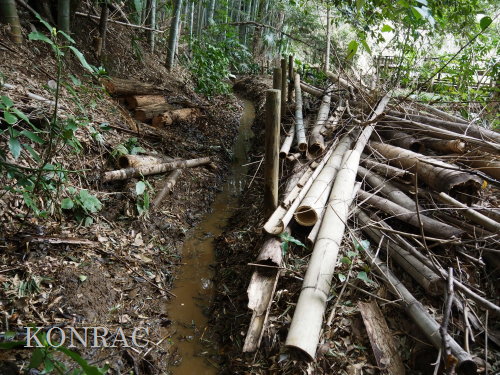 この水流に面した竹林の伐採管理を行ってくれたとの報告をいただいていましたので、落葉などが斜面から落とされている可能性もあります。
