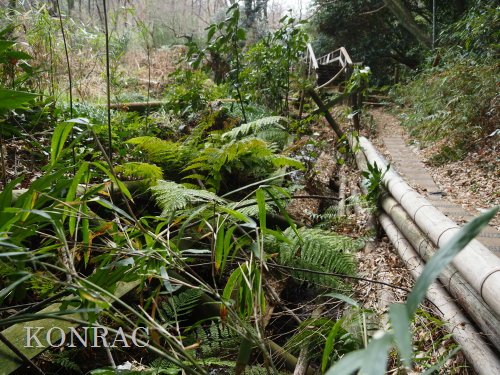 ただ、この辺りは竹林(A08)下の園路に接しており、この部分の園路柵が完全に水流に落ちてしまっていますので、落ちている支柱や柵が作業の邪魔になります。