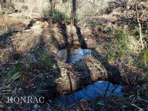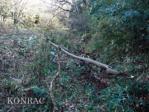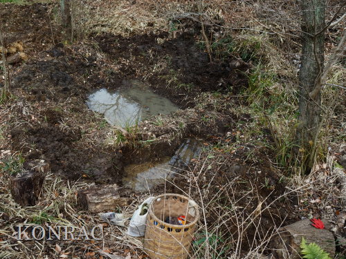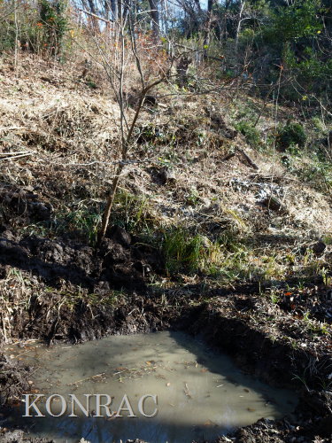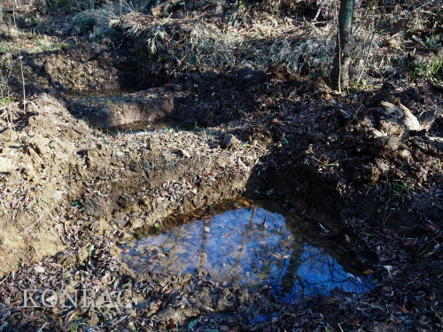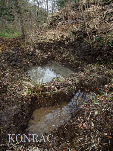 この水溜まり穴は、水が涸れることなく、水深の変化が一番少ないと思いましたので、 源頭部の水源池としては、この水溜まり穴02、04の場所が良いのではないかと思いました。 そこで、今回は、この二つの水溜まり穴を大きくしてみることにしました。 ただ、両斜面の裾部には大径木の伐採材が積んであったので、裾部まで削って掘ることは気が進みません。 02と04を合わせて、一つにすることも考えましたが、現状では高さが少し異なりましたので、まずは二つの池にすることにしました。 かなり大きくはなったと思いますが、水底は粘土質になっていないので、もう少し掘れると思いましたが、今回の活動はここまでとしました。 気温 10.4℃、湿度 41.3%