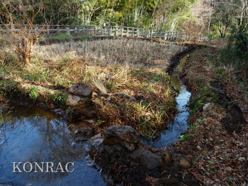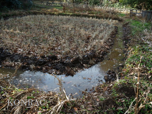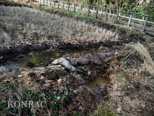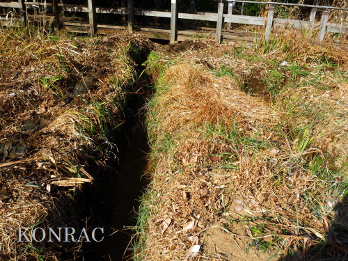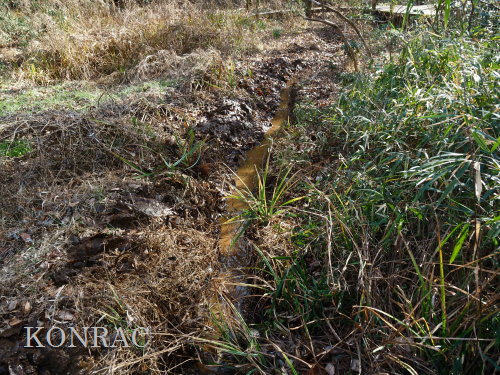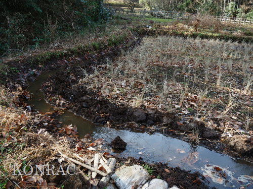 木道下を抜けて来る導水路の水の流れが気になったので、この田圃上の水路の泥上げを行いました。