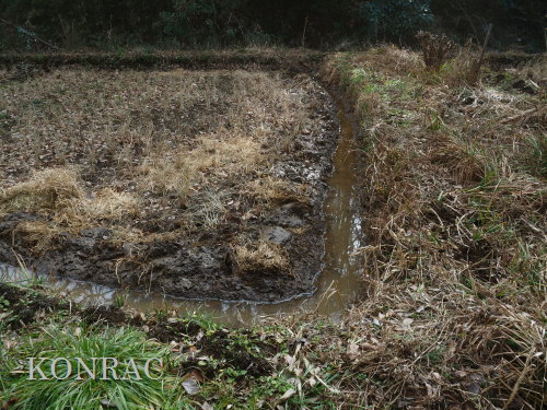 しかし、下の段には地面が広がっていました。 ただ、その土は湿った土でした。 水漏れ穴が見つかれば、それが原因だと思うのですが、非常に少ない流量の水が田圃の土に染み込んで消えているとしか考えられません。 畦沿いの溝を掘り直しながら、水漏れ穴かも知れないと思わせる穴を塞いで、外周の水面の輪をつくりました。
