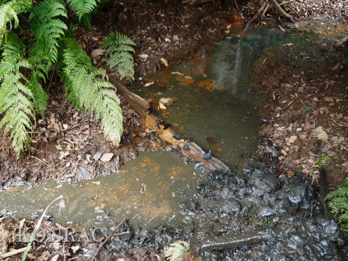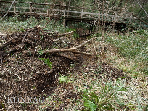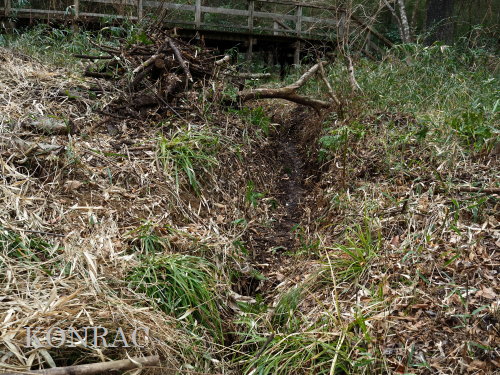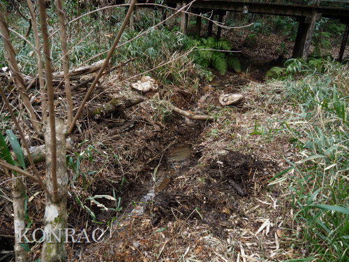 材を取り出した水路を調べましたが、途中に、何処に通じているのか不明の穴が開いていました。 この穴を埋めて、水漏れしないようにできるかは分かりません。 ただ.、ハンノキ林上の池からの水は、水路を舐めるように流れて、その穴に達していました。