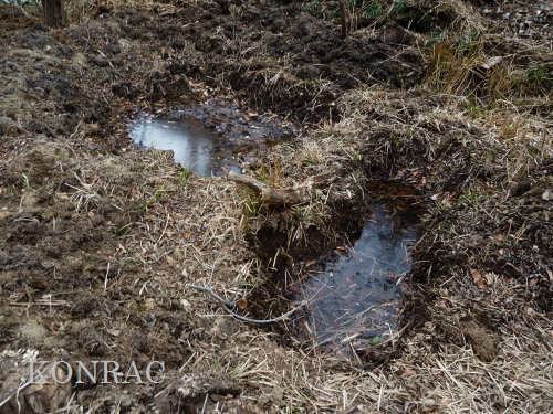 水辺再生のために掘った水溜まり穴の水は減少して、少なくなっており、干上がっていた穴もありました。