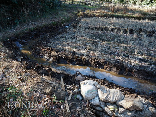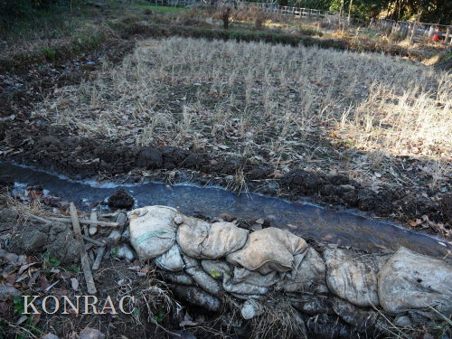 一雨降れば、水面が広がるかも知れませんが、今湛水させる方法は分かりません。 下の段を横断する溝を掘って、水面を広げました。