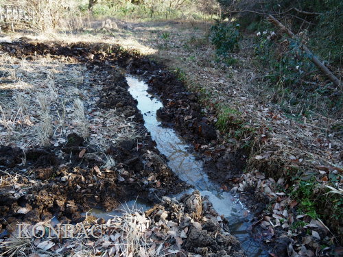 ヤブを無くすと、水流には水底を舐めるように水面が薄く広がっていました。 ここで合流させるのであれば、この部分の水流を浅い階段状にできるかどうかが課題になりそうです。 また、湿地地区3段目から、谷戸左岸水流に、生物の往来が可能な形で水を流すことができるなら、 合流部では、今までと同様の流し方で、谷戸左岸水流としては源頭部として染み出してきた水を流しておけば良いと思います。