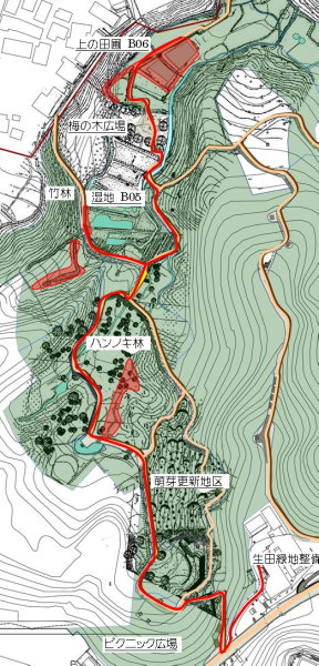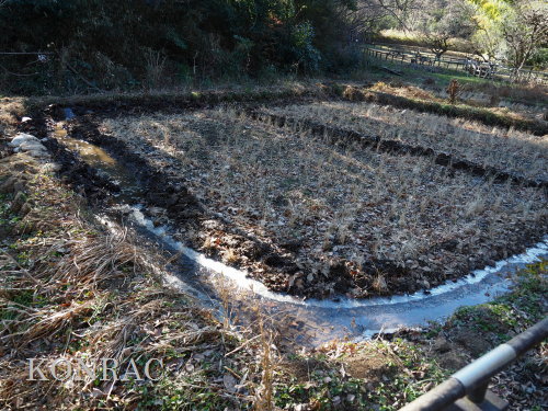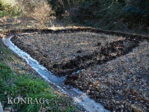 (上図)活動場所位置図 (イ)上の田圃を湛水させる活動 今日も上の田圃に直行しましたが、下の段に流入させている水は溝の中で、薄氷を張っていました。