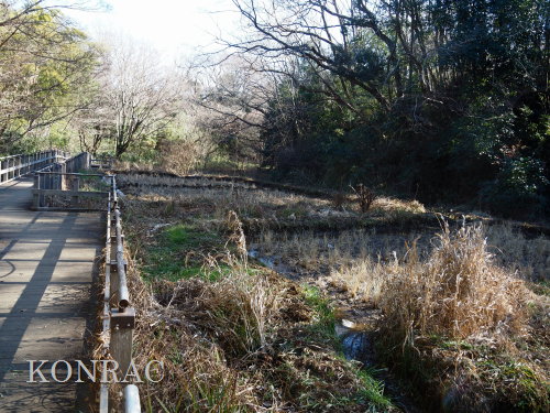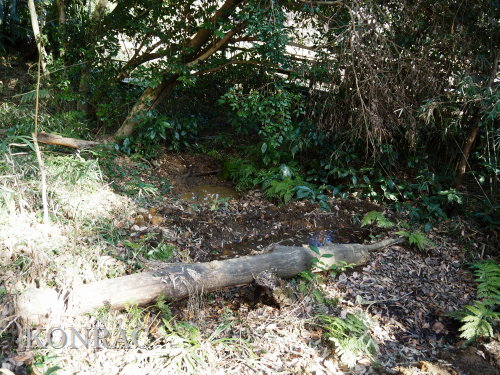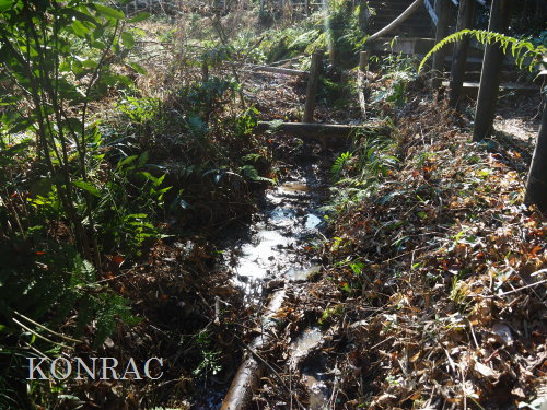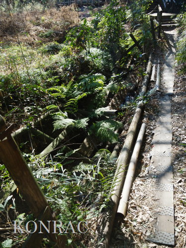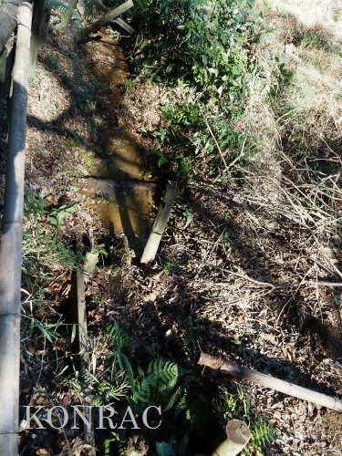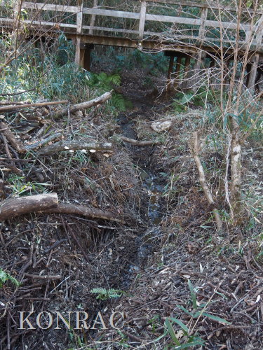 (ロ)竹林下辺りの谷戸左岸水流(湿地地区) 今までは、竹林と湿地地区の間の谷戸左岸水流の上端部は、湿地地区1段目からの水と竹林下谷戸からの水を、湿地地区2段目に入れるための場として管理していました。 これからは、谷戸左岸水流を上の田圃に水を供給するための水流として、意識的に保全することを考えました。 その保全管理の基本は、ホトケドジョウやオニヤンマなどの生物が、谷戸の水辺を自由に往来できることだと考えました。 現状は、竹林下の園路の路面が崩れて、柵が水流内に倒れ込んで、伐採材などを捨ててあったり、ヤブになったりしていました。 今回は、この合流部のアズマネザサやシダを刈って、除けられる材は除けて、水流の状態を確認できるようにしました。