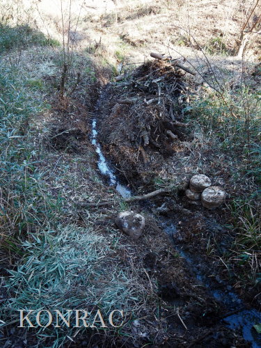 堰までの水路の邪魔な材を切り捨て、水が流れるかを見ようとしましたが、染み出していた水が凍っているだけでした。