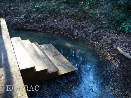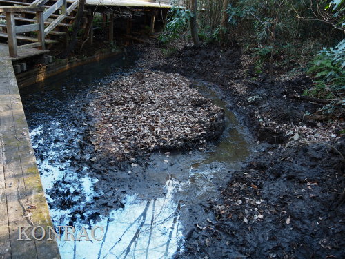 昨秋以降、ハンノキ林の水辺を再生しようと取り組んでいました。 ハンノキ林上の池の水の活かし方が課題だと思っていましたので、降雨の期待できない時期とは思いながら、一先ず、泥上げを行うことにしました。 一昨日、1/27(火)に、ハンノキ林上の池の堰の板1枚を外して、池の水を流しましたが、その流れは止まっていました。 同日、池の1回目の泥上げを行いました。 そして、この日は、その池の水面はすっかり下がっていました。
