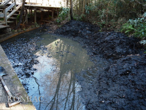 ハンノキ林上の池の泥上げは、今回で、やり終えたいと思いましたが、粘土混じりの土砂の中に、落枝や竹、建設廃材などが埋もれていたりして、 完了とは言い難い状態でしたが、時間が来たので、この日の活動を終えました。 腰痛持ちの後期高齢者1人の活動ですから、これだけできれば上等だと思います。 後は、水底に沈んで溜まっている泥を取り出すこと、樹林に掘られていた水路の確認と泥上げを行うこと、堰の内側に溜まっていた泥を掘り上げること、 周囲の樹木を間伐し、アズマネザサを刈ることなどを行えば、現段階でのハンノキ林上の池の手入れは完了します。
