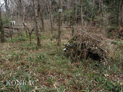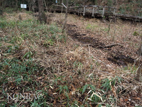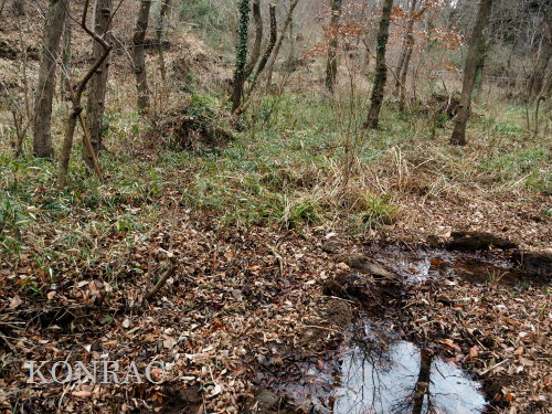 昨夜の降雨のお陰で、辺りの地表は湿って、春を感じさせてくれるようになりました。 ハンノキ林の下草刈りは5回目になりますが、私の刈り方は雑なので、今まで刈った範囲を見ても、草刈りが済んでいるようには見えません。 相変わらず、ミヤマカンスゲの大株が繁茂していますので、ジロボウエンゴサクは発芽できないかも知れません。 主な目的は、アズマネザサ、オカウコギ、ノイバラ、フジなどのツル植物がつくっていたヤブを解消し、実生低木などを低くすることなどです。 また、落枝や、夏期に刈って置いてあったミヤマシラスゲなどの片付けも行いました。 東側の水流は涸れていましたが、西側の水流は開放水面が保たれていました。
