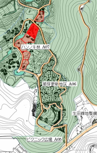 (上図)活動場所図 ハンノキ林の下草刈りを終わらせておきたいと考えて、谷戸に降りました。 今朝は出迎えが無いのかと思いながら、ピクニック広場のベンチ付近まで来たら、園路が階段になる辺りに、シロハラが待っていました。 追い払うつもりはありませんが、写真を撮ってから、通らせてもらいました。
