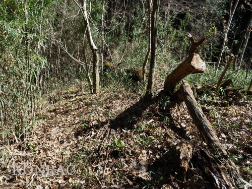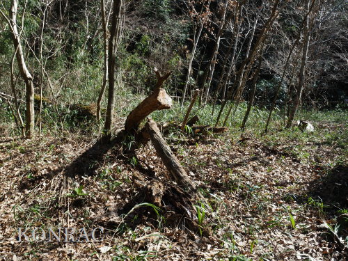城山下谷戸合流部に移動しましたが、ここの水辺も完全に涸れていました。 合流部から城山下谷戸苗木畑に移動しました。 苗木畑は、2005年3月に、アパートが撤去された跡地です。 2007年3月に、北部公園事務所が押沼峠の工事残土の一部を搬入して、雑木林の植生管理に必要な苗木畑として使えるように、覆土してくれた場所です。 生田緑地の皆伐更新に使う目的でしたが、皆伐更新地区では、自然に発芽した実生を育てて雑木林を育成することができたので、苗木は必要なくなりました。 苗木畑の苗木は育っていたので、そのまま樹林にすることにしました。 2023年度末に、戸隠不動尊跡からの園路途中にあったナラ枯れ大径木を、生田緑地整備事務所が伐採してくれたのですが、苗木畑の上に伐倒して、そのまま放置されました。 1年後の2025年3月に、この伐倒によって受けたダメージを取り除くための活動を行いましたが、直径50〜60cmの幹材は片づけようがありませんでした。 ただ、苗木畑の苗木の中には、直径15cm超のものもありましたので、2025/3/25(火)に、苗木のうちの1本を萌芽更新目的で伐採しました。 これは、2025年夏期に萌芽しましたが、弱弱しい細い萌芽枝です。 もともと弱っていたことと、アズマネザサに覆われてしまっていたためと思います。 この伐り株周りから始めて、苗木畑のアズマネザサ刈り、材の片付けなどを行いました。
