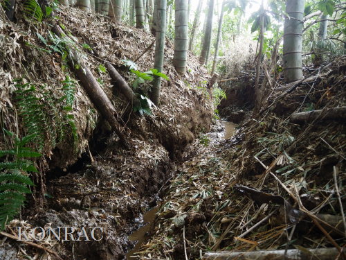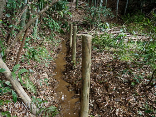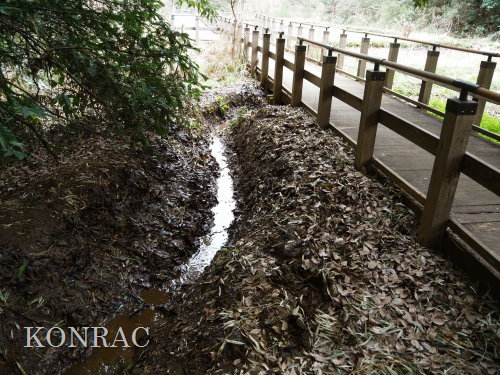 この水流に面した竹林の伐採管理を行ってくれたとの報告をいただいていましたので、落葉などが斜面から落とされている可能性もあります。